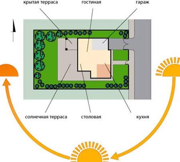 На плане нужно отметить, в каком месте преобладает тень, а где солнечные зоны.