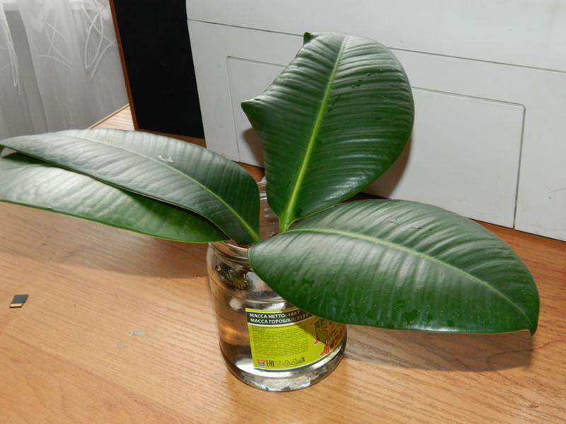 Черенок помещается в емкость с водой. Вместо того чтобы наливать воду, можно также выстелить дно емкости мокрой ватой. Емкость с фикусом нужно убрать в теплое место на 3–4 недели. За это время черенок укоренится и будет готов к пересадке. А также знаком, что растение готово к пересадке, могут послужить молодые листочки на черенке.