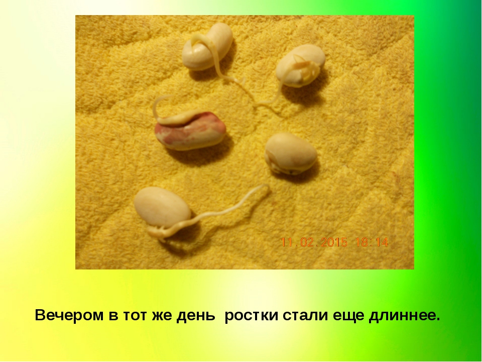 В зависимости от семян вы можете увидеть, как они прорастают через 24 часа.Наши проросли только на 3-й день. Вы можете видеть, как твердая оболочка треснула и развился зародышевый корень (называемый корешком).