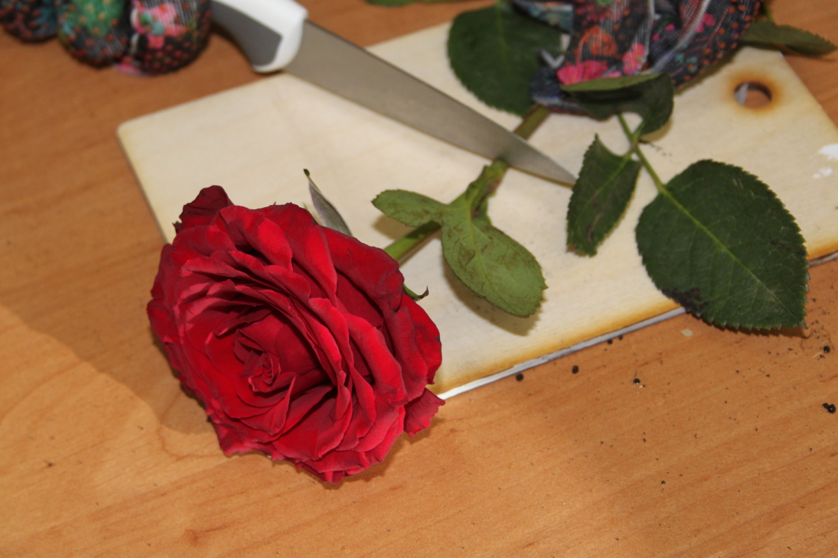 - Необходимо выбрать розы со свежими зелеными стеблями, убрать лишние листья и бутоны.