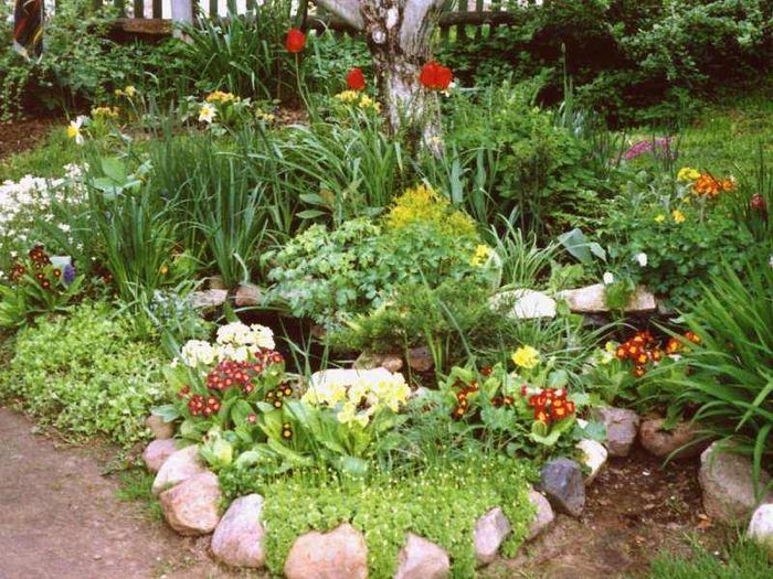Для начинающих садоводов этот цветник можно считать идеальным вариантом. Никаких строгих форм и указаний. Полная свобода действий. Здесь можно сочетать однолетники, многолетники и луковичные цветы. Если будут использоваться высокорослые цветы, то рекомендуется сажать их так, чтобы они не затеняли остальные (это правило распространяется на все виды клумб).