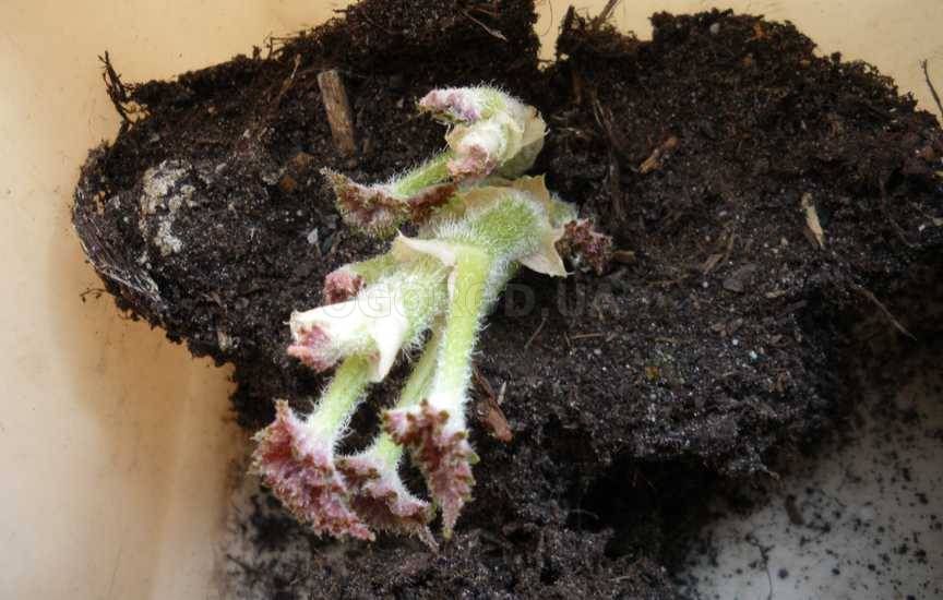 Высаживаются разрезанные части в подготовленный грунт. Слегка присыпаются землей, при этом на поверхности оставляют почки.
