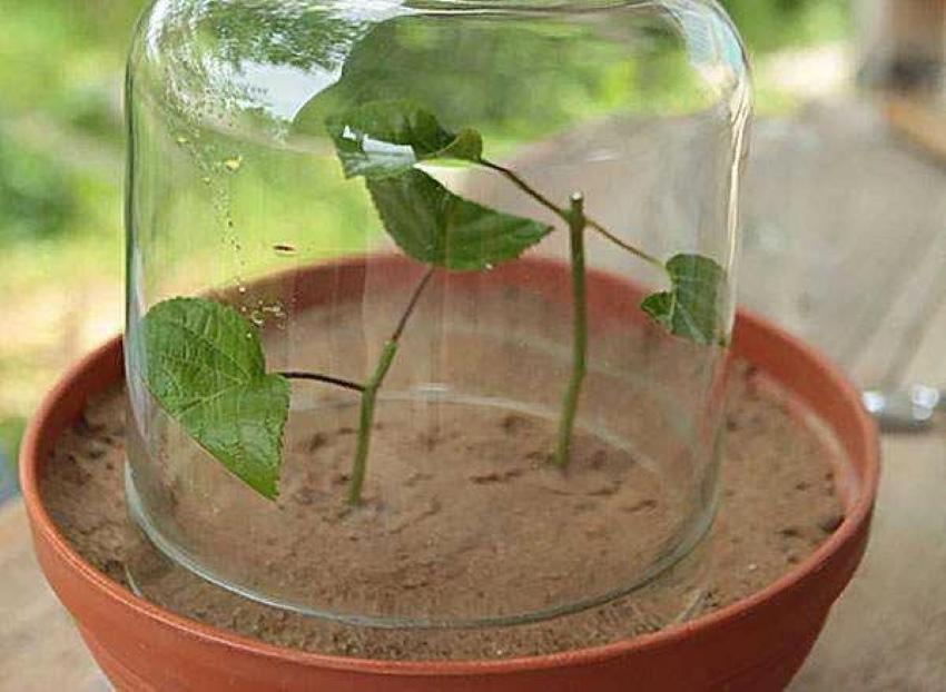 - Слегка увлажните подготовленный грунт с помощью распылителя и рассаживайте черенки на глубину не более 2-3 см. Верхние почки с оставленными листочками ни в коем случае не должны касаться грунта. Для быстрого укоренения необходимо накрыть высаженный материал стеклянными банками или обрезанными пластиковыми бутылками. Каждый саженец накрывать нужно отдельной банкой. Если вы решили не накрывать посадки, то расстояние между черенками должно составлять 5-7 см.