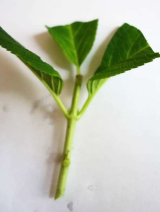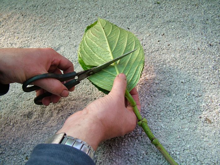 - Нарезанные побеги гортензии можно разделить на несколько черенков. Главное, чтобы на каждом из них располагалось не менее 2-3 пар листьев. Нижнюю пару листьев нужно срезать, а вот верхние листочки укоротите на треть или наполовину. И еще один нюанс: оба среза, верхний и нижний, нужно сделать на расстоянии не менее 1 см от почки. Срезы желательно делать косыми.