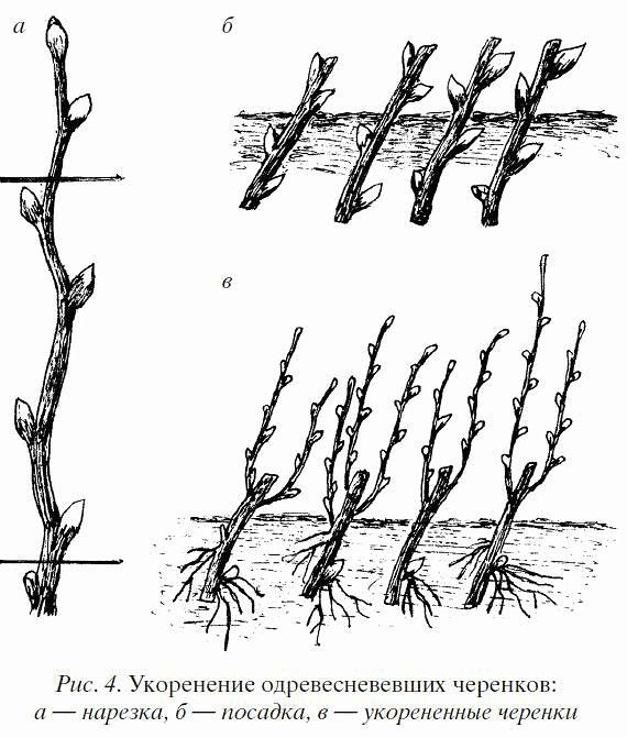 - Осенними черенками. Самый популярный способ. Осенью следует срезать молодые покрытые корой побеги этого года. Эти побеги нарезают на более мелкие черенки длиной 15-20 см. На каждом таком побеге оставляют по 4-5 почек. Высадить в землю, оставив две почки на поверхности.