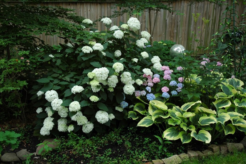 Достаточно часто вместе с гидрангеями выращивают хосты. Практикуется и совместное выращивание гортензий с розами, с другими крупными цветами и скелетными культурами. Многолетние культуры сочетаются с гортензиями как в цветниках, так и в рабатках, и просто в высаженных группой в саду растений.