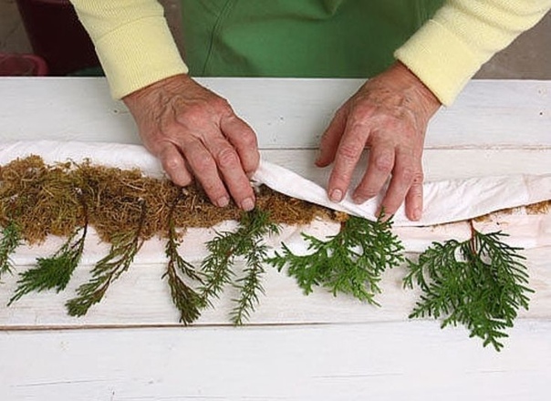 Мох пропитывается кипяченой прохладной водой в течение 2-3 часов. Посередине ткани следует положить пропитанный мох, сверху на него кладутся черенки, с соблюдением расстояния между ними. Ткань сгибается таким образом, чтобы зеленая часть не выступала наружу. Ткань перетягивается веревкой или резинкой. Сверток следует поместить в пакет и повесить дома на хорошо освещенное место (на окно).