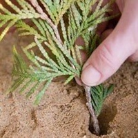 Опытные садовники, знающие, как вырастить тую из черенка, дали данному растению название «пятка». Чем длиннее «пятка», тем лучше будет укоренен побег. Для того, чтобы сорвать ветку с наличием такой «пятки», обычно используют нож или просто резким движением вниз срывают ветку. Все ненужные веточки и листья убираем. Заранее необходимо подготовить горшок с торфом и листовой землей (в пропорции 1 к 1). Сам черенок углубляем на два сантиметра в землю под углом в 60 градусов. Территорию вокруг посаженного черенка следует присыпать песком и слегка прижать его пальцем.