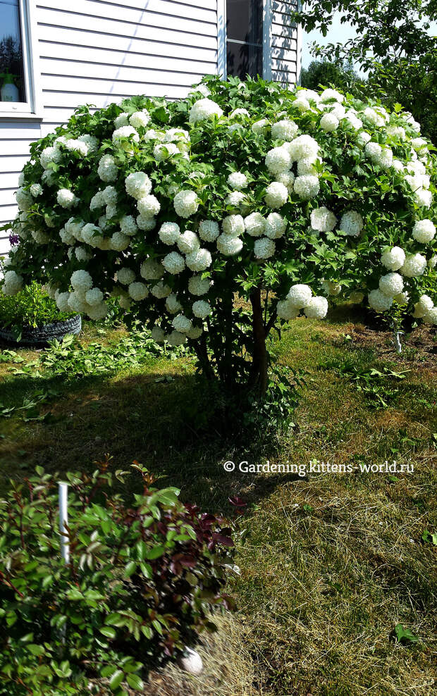 Вырастить кустарник действительно оказалось очень просто – он хорошо переносит зимы, никогда не страдал от грибков и вредителей, не требует частых подкормок. По сути, нужно заниматься только поливом. И цветение культуры при этом очень обильное – в конце мая куст буквально покрывается белыми шарами.