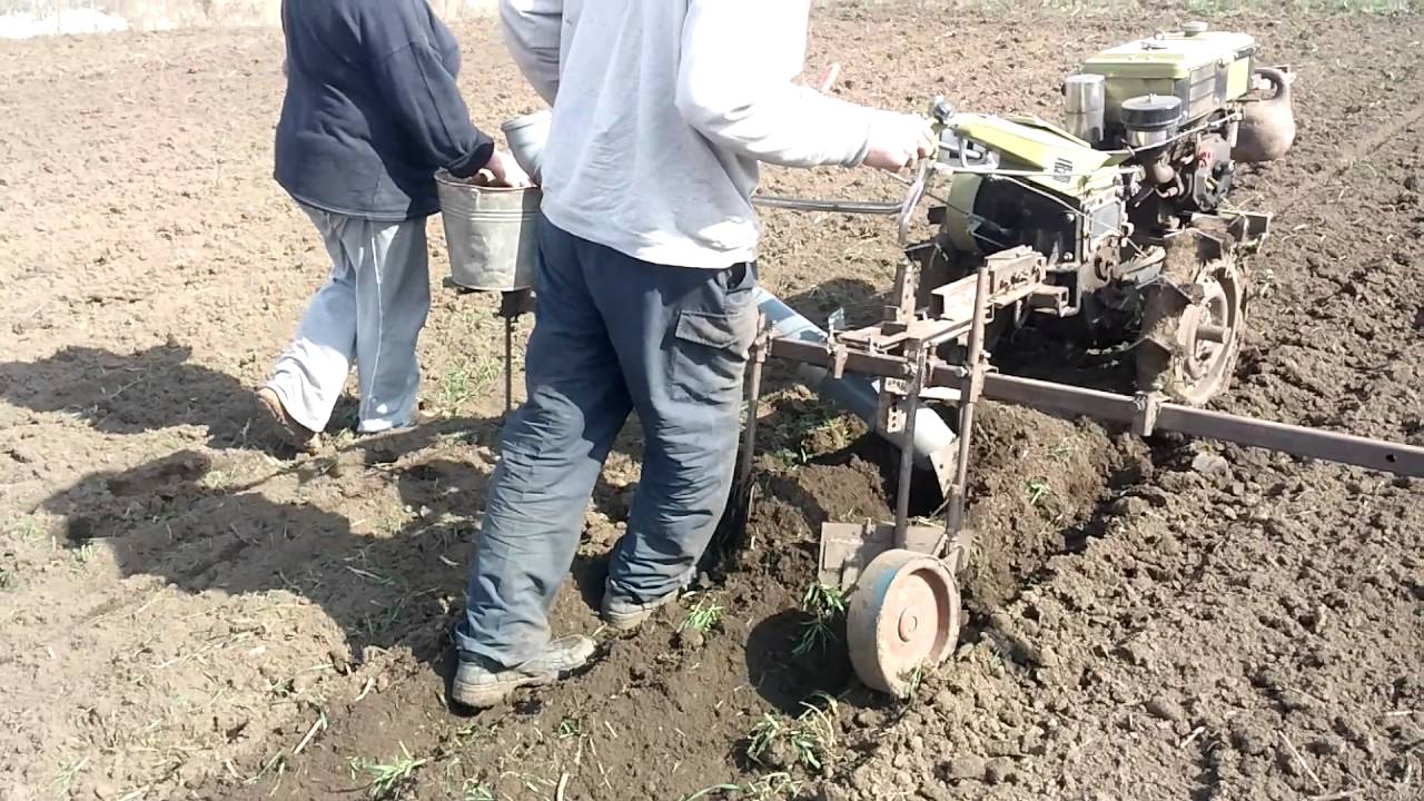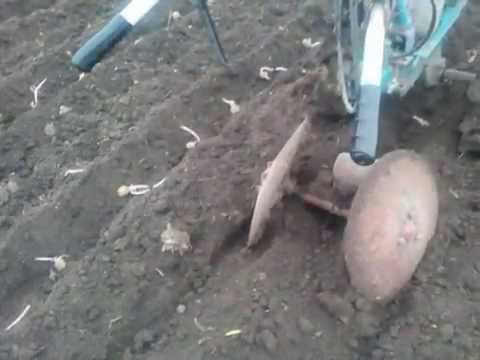 Еще дачники используют способ посадки мотоблоком под плуг. Для этих целей на грунтозацепные колеса монтируют колеса и плуг. Благодаря плугу намечается первая бороздка. Клубни картофеля стоит бросать в ряд, так как в конце агрегат с плугом разворачивается и только одной стороной выполняют новые бороздки, а также заваливает землей уже посаженные клубни.