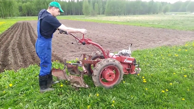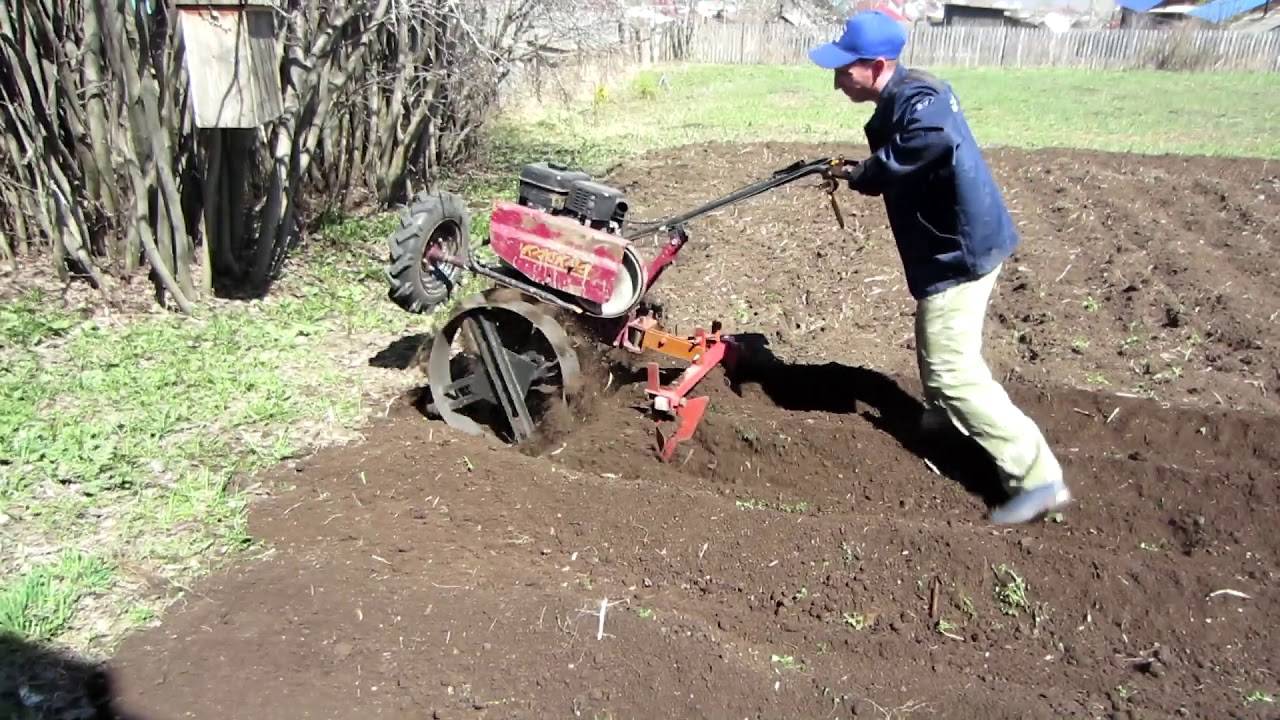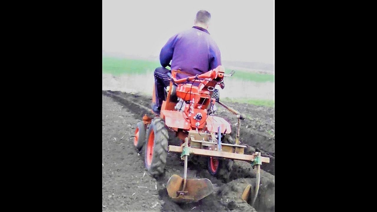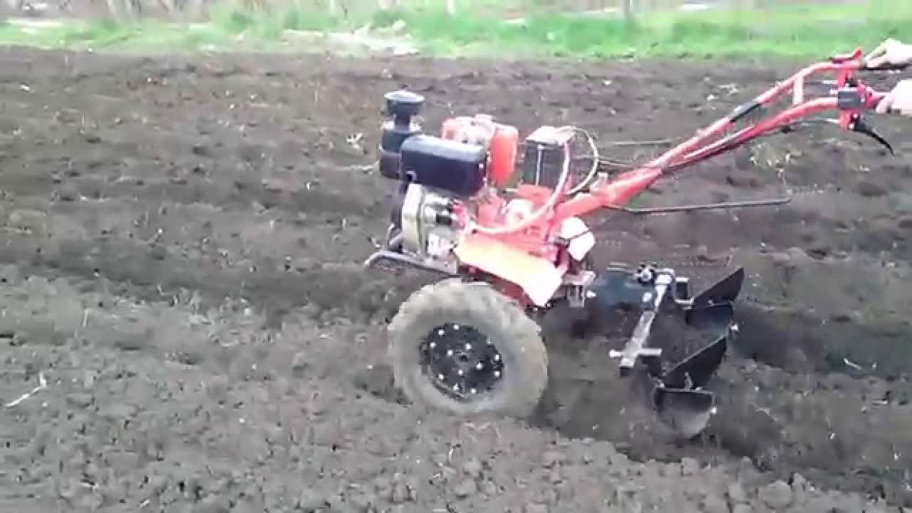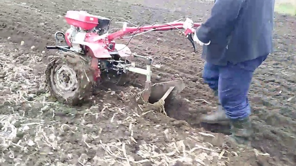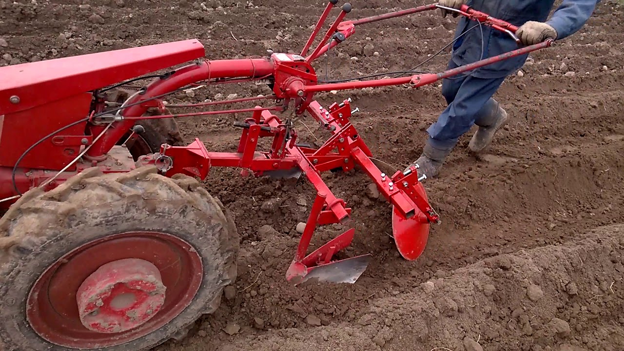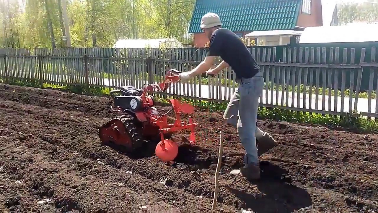 В начале пути производится регулировка глубины заделки плуга в землю (обычно используется размер штыка лопаты). Расстояние между бороздами регулируется по ширине колеи между колесами мотоблока. Работа производится на первой скорости.