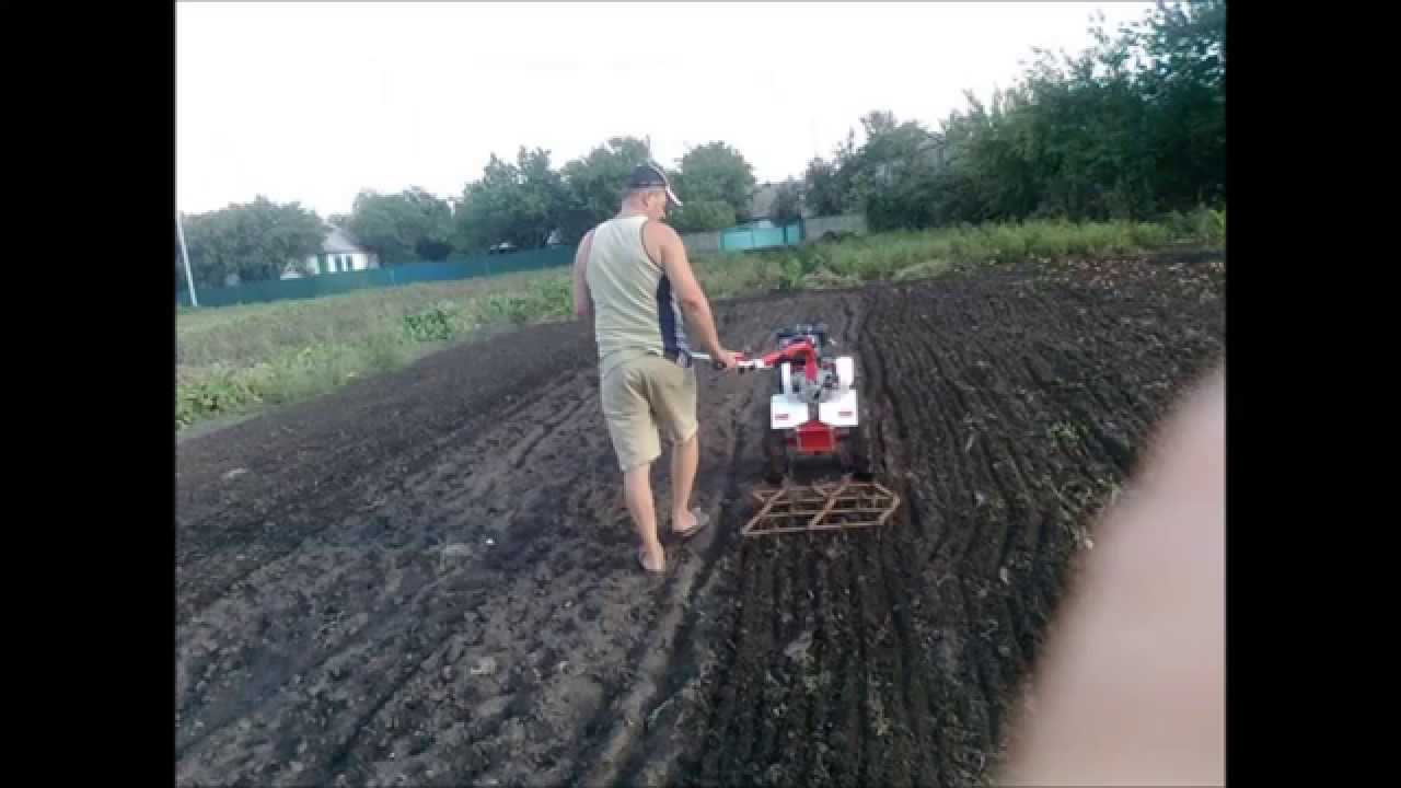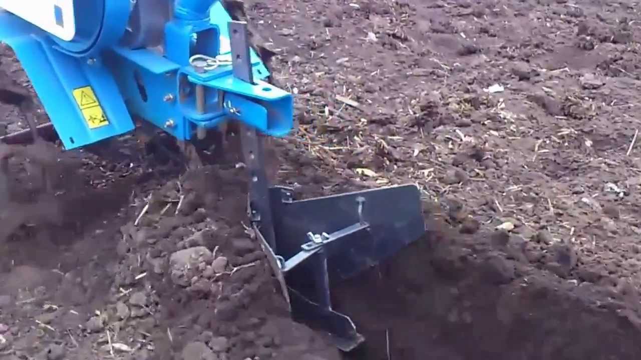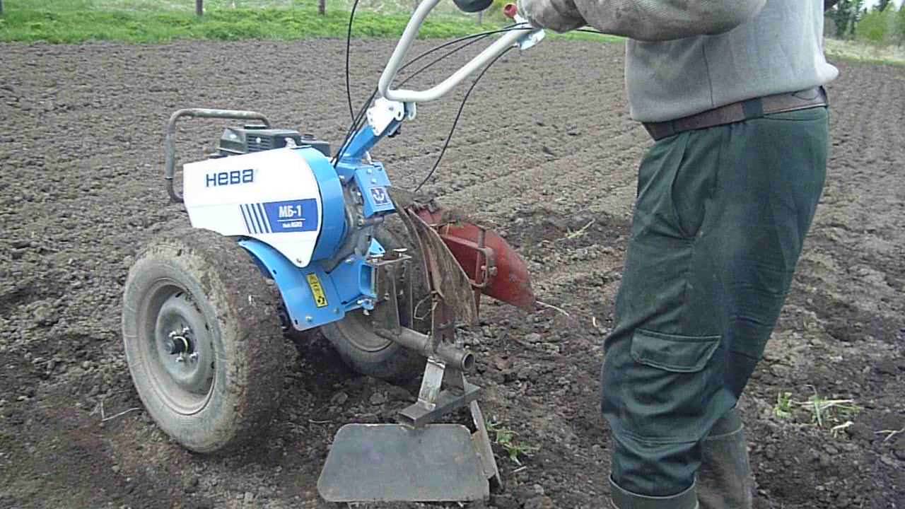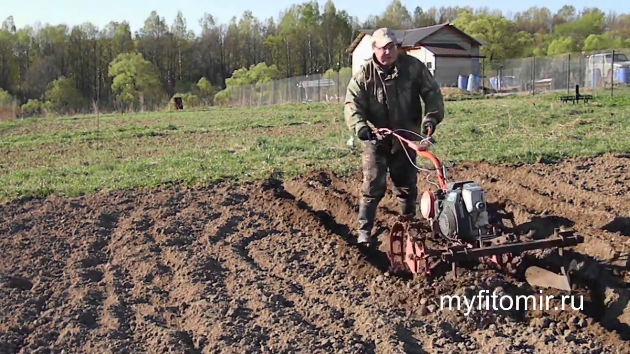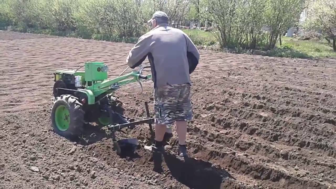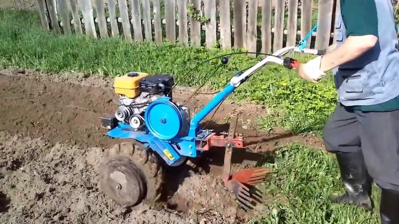 В начале пути производится регулировка глубины заделки плуга в землю (обычно используется размер штыка лопаты). Расстояние между бороздами регулируется по ширине колеи между колесами мотоблока. Работа производится на первой скорости.