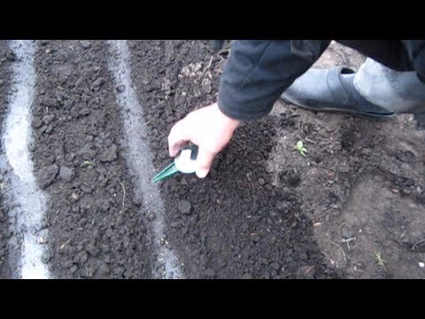 Выкопайте в грунте бороздки глубиной в 2-3 см. Если грунт лёгкий, то глубина 3 см. Если почва тяжёлая (то есть плотная), то глубина в 1,5 см. Разместите в грунте семена. Заделайте бороздки почвой, которая была заготовлена заранее и стояла в помещении. После заделки примните слегка почву.