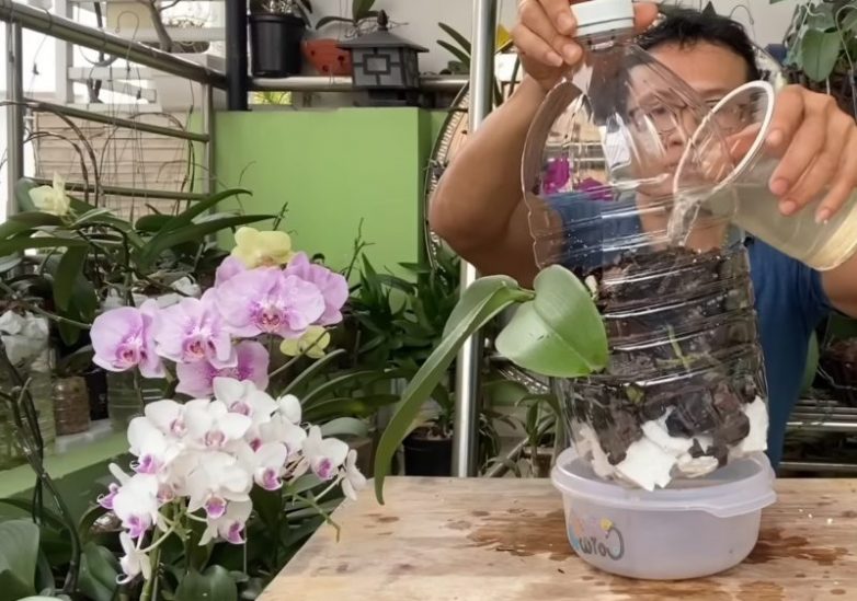 -поливочный горшок. Это поможет удалить любые накопленные соли, которые могут повредить корни орхидеи.