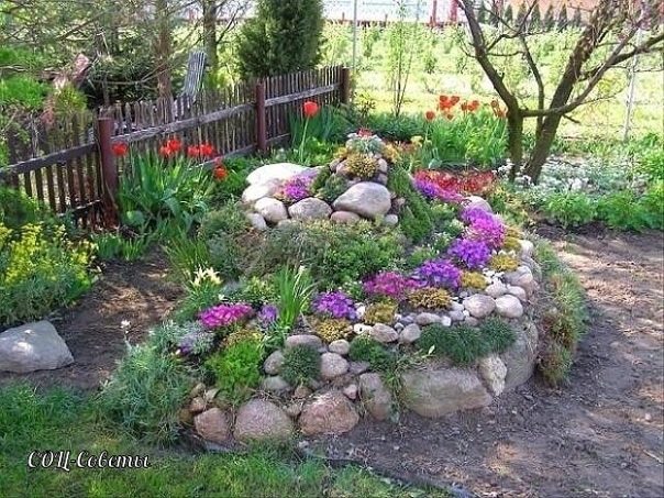 Внешне такая горка будет ни чуть не хуже, а может даже лучше настоящей альпийской. Она менее требовательна в уходе и поливе. А когда вам захочется поменять что-то в саду и убрать эту горку — вы легко уберете камни, лежащие на поверхности, и перенесете ничем не засоренную землю.