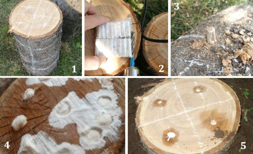 Помимо грунта с грибницей можно получить грибы с помощью коряги, коры или пенька, зараженного им. Однако на древесине с успехом живут не только вкусные и питательные грибы, но и ядовитые плесневые споры. Поэтому лучше всего трухлявый пень или чурку заселять благородной грибной культурой самостоятельно. Для этого в древесной толщи следует проделать углубление, куда и поместить грибницу. После чего посадку следует увлажнить, в дальнейшем не допускать ее пересыхания. Примечательно, что пень-донор и пересадочный пень должны быть одной породы.