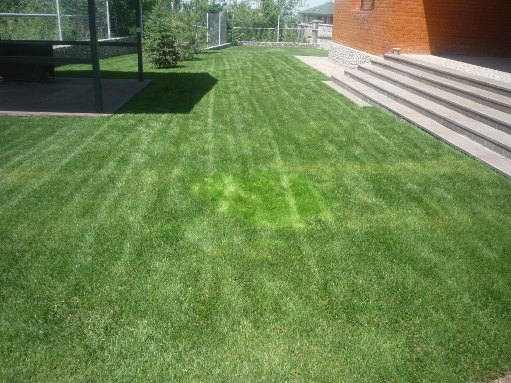 Нужно поливать не слишком часто (раз в неделю), но обильно. Если очень жарко, а почва песчаная — дважды в неделю. Признаком начать «поить» лужайку служит упругость травы: как только она снизилась, пора. Если мучить газон жаждой, трава очень быстро пожелтеет, затем побуреет, и придется сильно потрудиться, чтобы восстановить красоту. Не стоит «поить» газон с утра или днем — большая часть воды испарится, а трава получит ожоги.