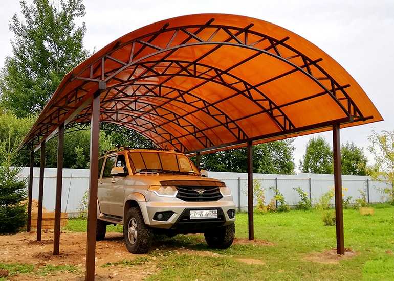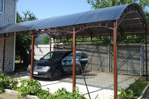 Хороший хозяин будет рад построить навес из поликарбоната для своего авто. Можно сделать оригинальную куполообразную форму, арочную, прямоугольную, косую – на любой вкус. Такой навес защитит автомобиль от солнечного перегрева или от дождя, когда вам некогда загонять машину в гараж. Это может быть отдельное строение, но чаще такую конструкцию пристраивают к гаражу – практично, и выглядит эффектно. Навес для автомобиля может служить дополнительной «стоянкой», когда к вам приезжают гости.
