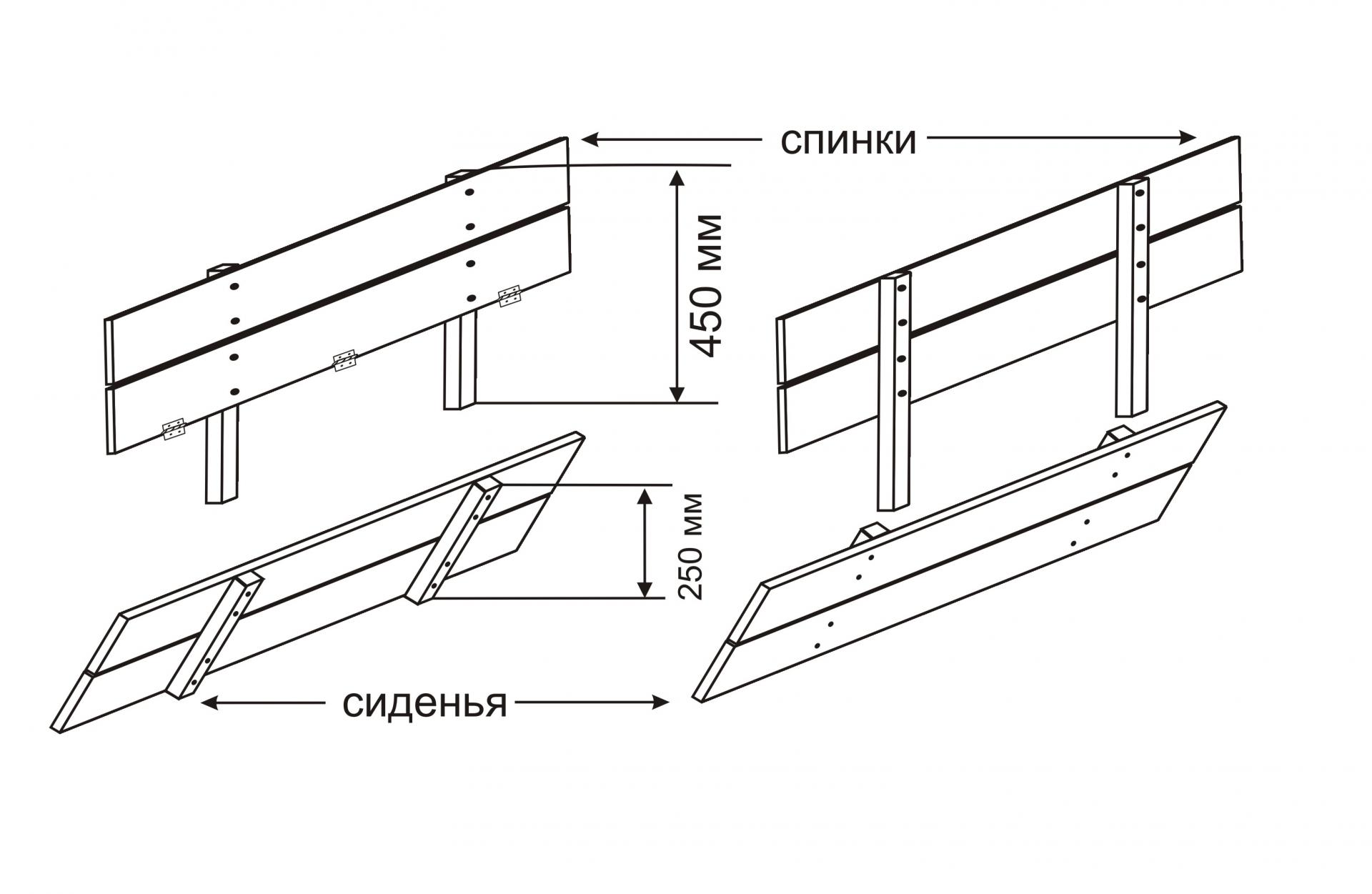Последние две доски будут использоваться для того, чтобы сделать спинку, которую также нужно закрепить с помощью петель. Для начала стоит крепить только одну доску. При установке второй нужно использовать бруски, которые будут целостно скреплять доски спинки между собой, а также не давать ей опрокинуться назад.