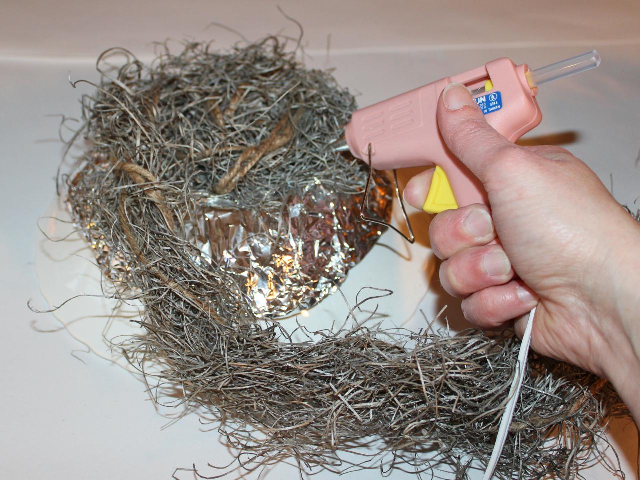 Возьмем клей — пистолет и нальем клея на ствол где будет гнездо, затем прокалываем пенопласт веткой, тем самым цепляем его. Обязательно подклейте где необходимо.