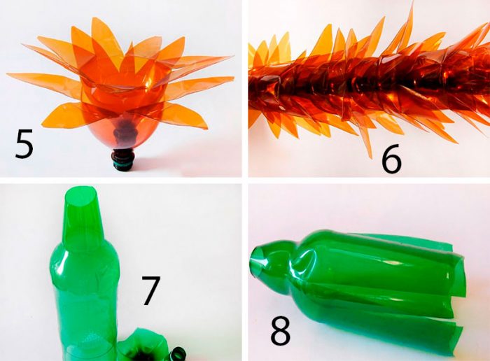 - Для этого требуется обрезать дно, надрезать бутылку на полоски до основания горлышка;