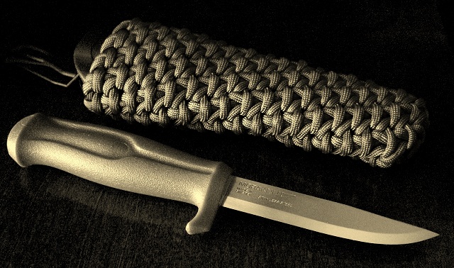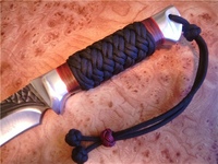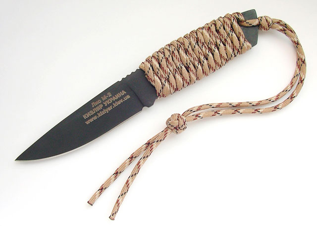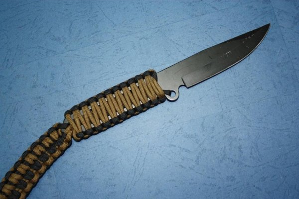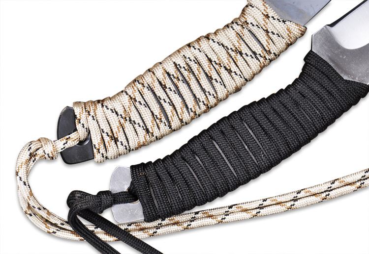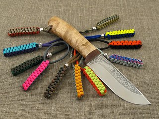 Далеко не все ножи имеют деревянную пластиковую рукоять. Иногда конструкция подразумевает оставить голый хвостовик, который может выскальзывать из руки или холодить её. Чтобы этого избежать стальная рукоять обвивается по специальному методу – схемы плетения паракорда на рукоять ножа.