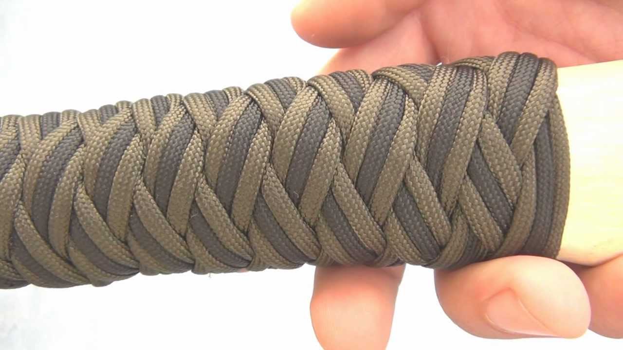 Эта накидка немного сложнее по стилю. Его часто используют на рукоятках мечей, рукоятках мачете и т.п. Он создает более толстый слой паракорда на рукоятке, поэтому он более мягкий и обеспечивает надежный, надежный, нескользящий захват.