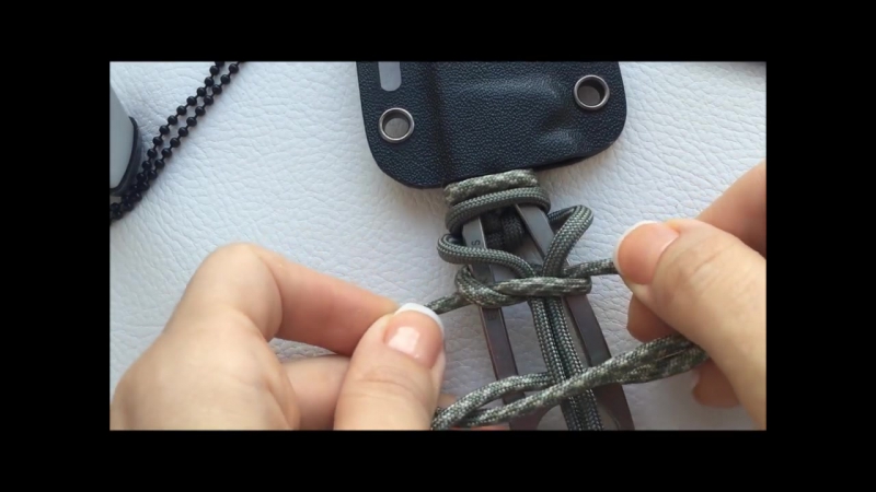 Теперь возьмите левую сторону паракорда и проведите ею над ножнами и под паракордом с противоположной стороны.