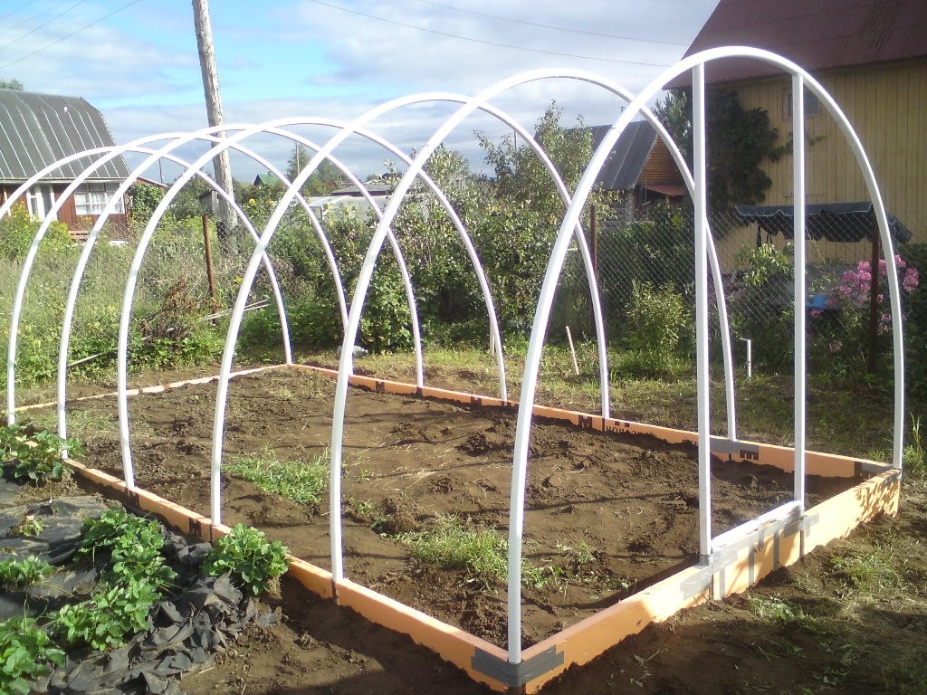 В одной конструкции дуги идут от самой земли. Если выгнуты они в виде радиуса, теряется много площади по краям, так как работать там очень неудобно из-за небольшой высоты.