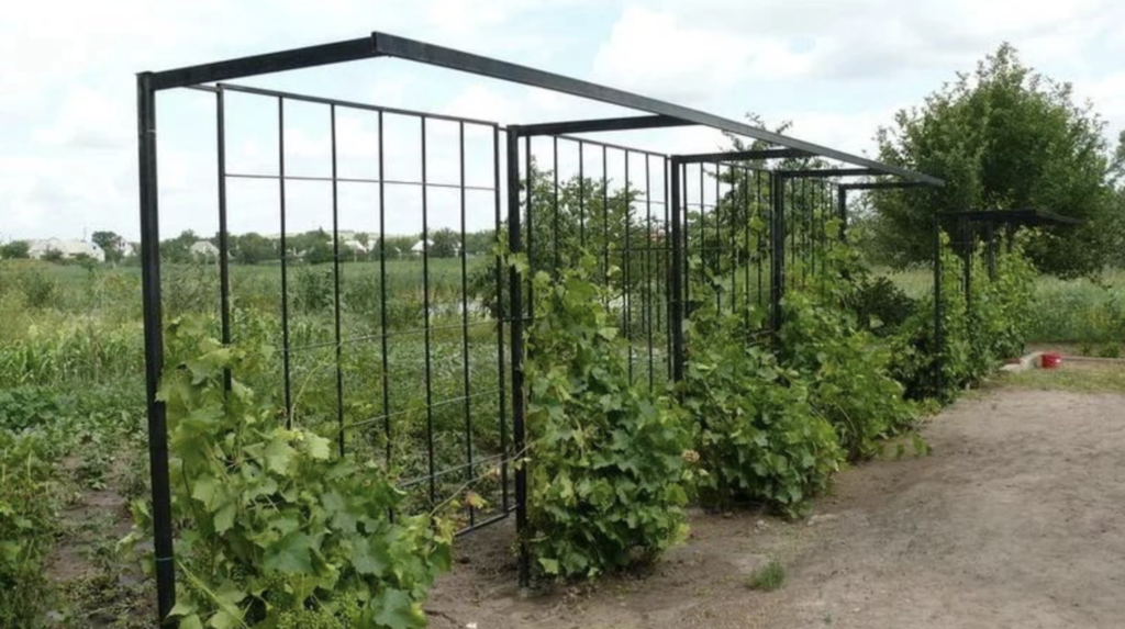 - Для большей прочности конструкции верхние края столбов соединяют между собой более тонкой металлической трубой или арматурой. Она позволит сооружению сохранять свою форму под тяжестью поспевающих гроздей.