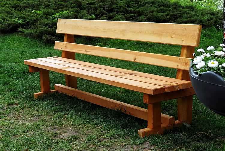 Вместо доски, для устройства скамейки на даче можно применить «пластины» вытесанные из спиленных деревьев. Придется, конечно, помахать топором, но зато такая пластина и прослужит долго, и стоить будет только вашей работы. Делается это следующим образом: обрезок ствола с одной стороны затёсывается топором, что бы получить ровную плоскую поверхность. Если бревно небольшого диаметра, сбиваем вместе два. Лавка получается массивная и прочная. И наконец, последнее — не пожалейте усилий и хорошенько, за два — три раза, окрасьте скамейку любой масляной краской. Теперь, ваша скамейка для дачи прослужит вам верой и правдой добрый десяток лет, а то и дольше.