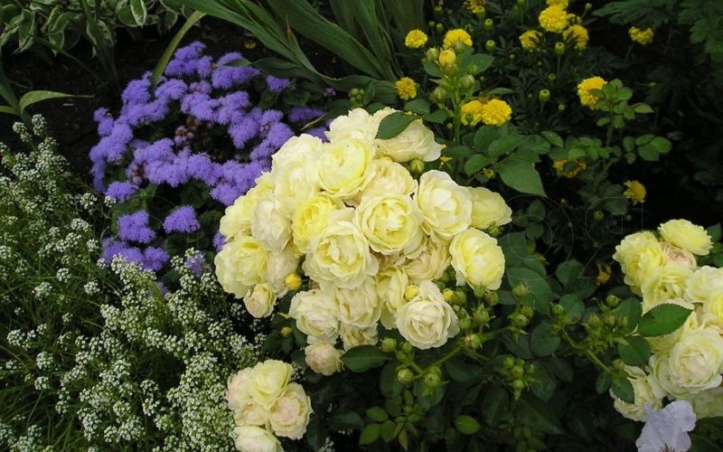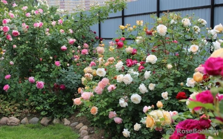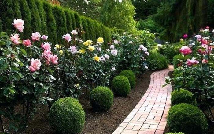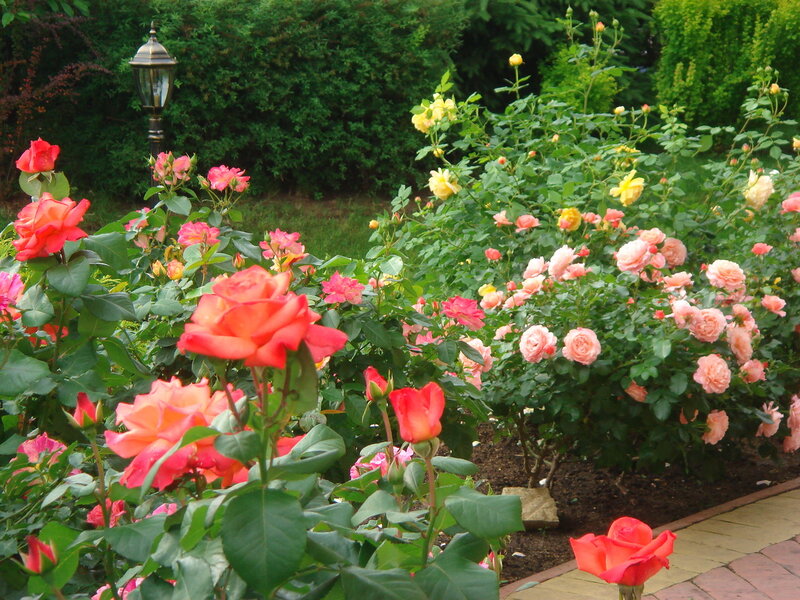 При создании розария рекомендуется следить за цветовым сочетанием используемых сортов.