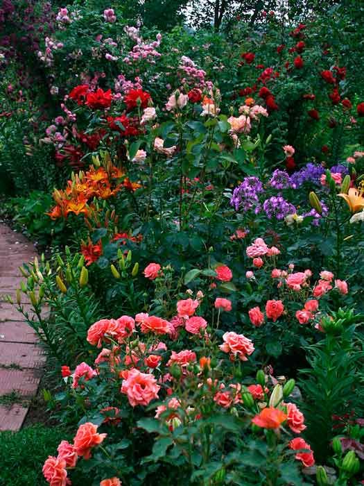 Это сад, который исключает только самые яркие золотые, желтые, резкие оранжевые и алые тона. Темно-розовые можно сажать с нежно-желтыми, насыщенно-оранжевые уживутся с белыми и малиновыми. Яркие коралловые можно сочетать с нежно-лососевыми или желтыми. То есть, 90% всех роз, которые встречаются в продаже, подойдут для этой схемы. Разумеется, не каждый отдельно взятый цвет хорошо смотрится с другим. Нежно-лавандовый не будет сочетаться с любой окраской, содержащей желтый пигмент – алый, желтый, лососевый, оранжевый или коралловый. Чисто-красные и малиновые тона почти всегда требуют «противовеса» в виде большого пятна бледной окраски. Данная схема с успехом применяется в Rosaraie de l’Hay недалеко от Парижа. Здесь сажают оранжевые и красные клумбы и крупные массивы белых цветов.
