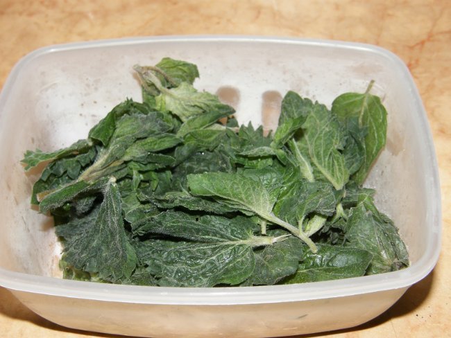 Мяту, предназначенную для напитков, замораживайте без стеблей, отдельными листочками. Подготовленную продукцию сложите в пластиковый контейнер и немного разрыхлите, чтобы обеспечить нормальную циркуляцию воздуха. Это предотвратит слипание листиков и поможет сохранить их аппетитный вид.