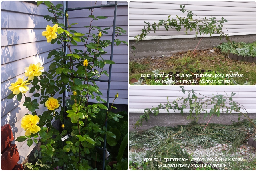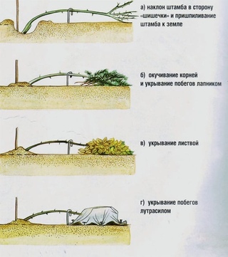 После уборочных работ, обрезки кустов, хвойными ветвями следует покрыть землю приствольного круга. Побеги, которые остались после обрезки, нужно аккуратно обернуть широкой тканевой верёвкой. Если у растения длинные ветви, то после обвязывания их следует бережно пригнуть к земле, насколько позволяет их гибкость (без угрозы излома). Закрепите ветки широкими металлическими скобами (куски плотной проволоки изогнуть по типу шпильки), забросайте сверху лапником. Главное – не забудьте устелить землю лапником в том месте, где будет лежать наземная часть куста. Особенно это относится к плетистым сортам.