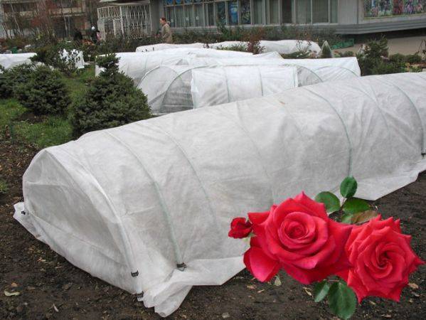 Данный материал широко используется в различных сферах, связанных с растениями. Накрывать им кусты на зиму – отличное решение, так как он хорошо пропускает воздух, одновременно защищает от морозов, не даёт скапливаться конденсату во время оттепели. Как использовать этот укрывной материал для роз на зиму? Опять же, лучше сделать каркас: металлические дуги или фрагменты сетки-рабицы подойдут для создания «козырька» над кустарником. Концы такого каркаса надежно закрепляют в почве, укрывной материал складывают вдвое (это важный момент!) и накрывают конструкцию. Края покрытия закрепляются описанными выше способами – при помощи тяжелых предметов или длинной доски (будет удобно приподнимать весной для проветривания).