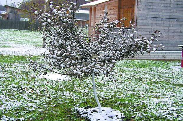 После появления первого снежного покрова опытные садоводы советуют использовать его для покрытия кроны яблони. Снег берут с дорожек, где нет растений. В течение зимы необходимо следить за переменами погоды, яблоня всегда должна оставаться под снегом. Необрезанные побеги могут оставаться открытыми. Укрывной материал убирается только тогда, когда сойдет весь снег. Исключение — полиэтиленовая пленка или рубероид. Эти материалы снимают при первой оттепели.