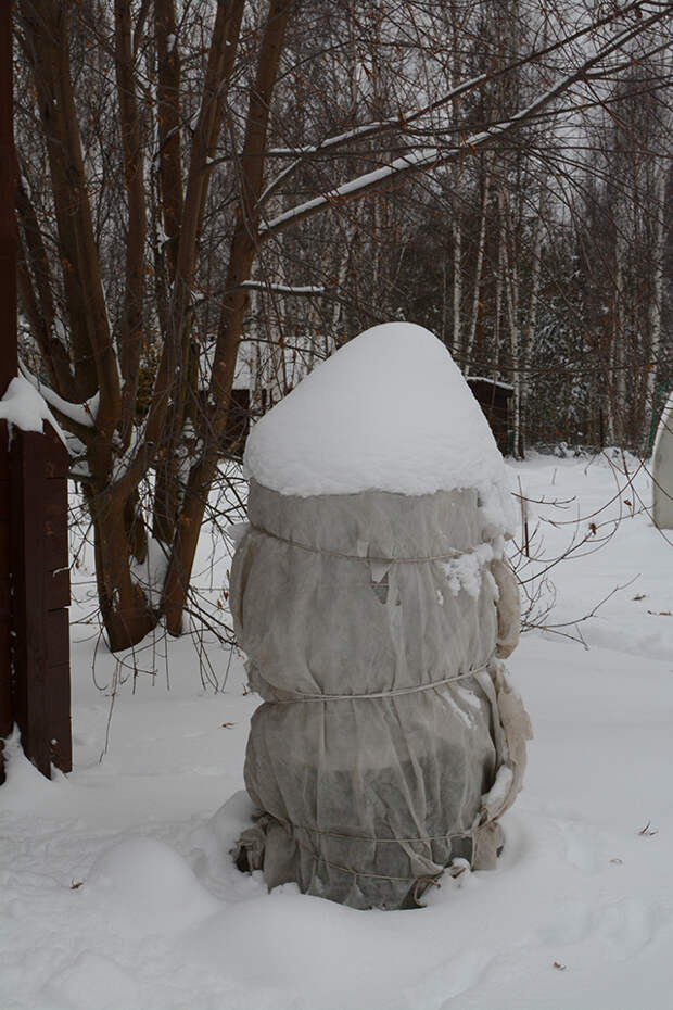 Пример использования мешковины и садового нетканого материала для защиты кустарников и небольших деревьев.