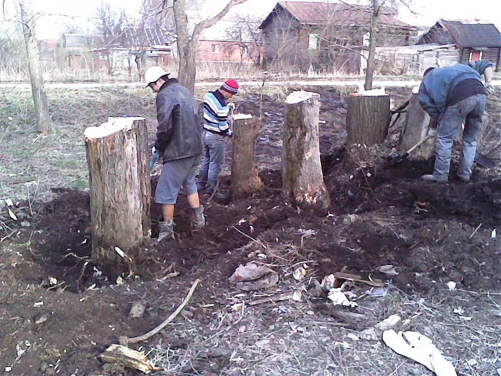 - Как убрать пень в саду, где много деревьев, кустов и грядок? Конечно, извлекать вручную. Нужно обкопать ствол вкруговую и постепенно перерезать корни, которые выйдут наружу. Оставшийся кусок ствола расшатывают чтобы показался самый главный стержневой (у большинства растений) корень. Перерубите его – и считайте дело сделано. Далее останется лишь вытянуть самые большие корни и утилизировать древесину с остатками. Из инвентаря пригодиться лопата, веревка, пила, топор, из спецодежды – садовые перчатки, очки, обувь на прочной подошве и комбинезон. Если ствол крупный – понадобиться помощник, а лучше два.