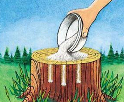 - Как убрать пень с помощью селитры (калиевой или натриевой) – этот метод уже можно отнести к химическим способам удаления зеленых насаждений, которые позволяет убрать остаток дерева несколько быстрее, чем описано выше. Дело в том, что селитра не просто помогает древесине быстрее разложится, но и позволяет удалить всю корневую систему, которая может находится очень глубоко в земле. Для этого на поверхности среза делаются множество отверстий, куда засыпается в большом количестве порошок селитры. Затем все углубления поливаются водой, чтобы вещество растворилось и уже после этого поверхность тщательно закупоривается, для предотвращения ее размывания осадками. (Если вы не знаете, как убрать большой пень без корчевания, то этот метод подойдет как нельзя лучше).
