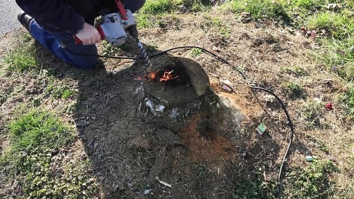 Для этого в пне просверливаются отверстия, в которые заливается насыщенный раствор аммиачной селитры. Дерево должно пропитаться раствором и просохнуть. Засохший пень можно поджечь – он полностью сгорит. Процесс нужно внимательно контролировать.