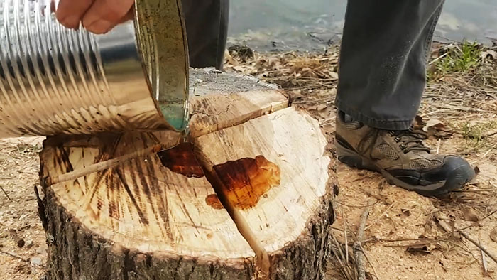 В этом процессе процесс химического разложения обычно занимает четыре недели. Еще две недели (или больше) необходимо, чтобы керосин пропитался через пень.