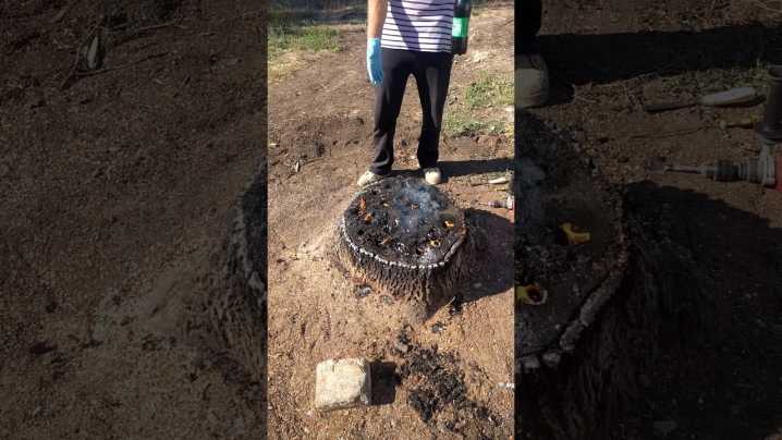 Для этого в пне проделываются множественные глубокие отверстия дрелью или бензопилой. В отверстия засыпается мочевина (мы рекомендуем использовать именно ее, т.к. в ней выше содержание азота), ее следует аккуратно полить водой, затем герметично закрыть отверстия чопами или полиэтиленом. За год азотосодержащая смесь полностью пропитает корни, после чего их легко можно будет уничтожить через сжигание костер или просто разрушить ломом.