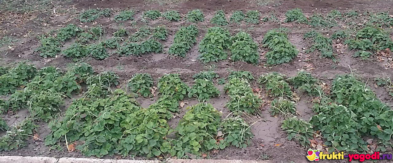 В засушливую осень, клубника ещё раз поливается, это способствует лучшему перенесению зимних холодов. Вокруг растений удаляются сорняки и при необходимости вырезаются повреждённые листья. Кустики окучиваются сухой землёй или перепревшим компостом, перегноем, торфом.