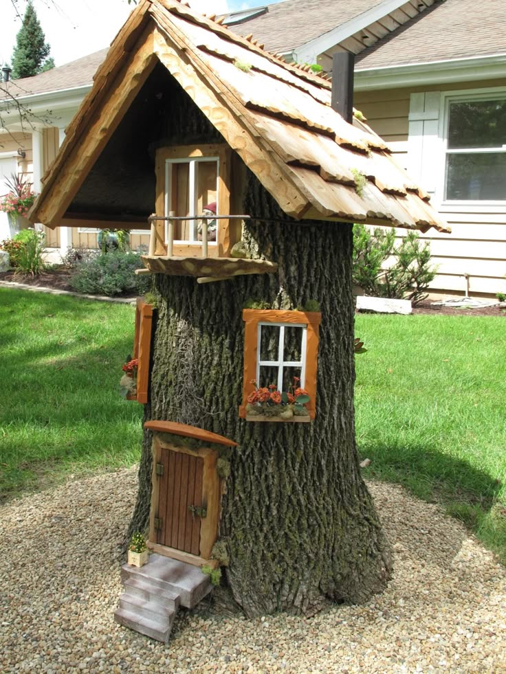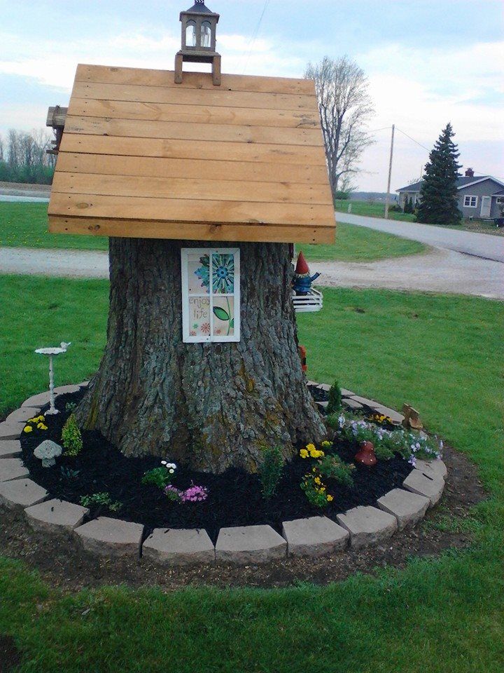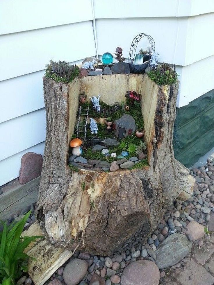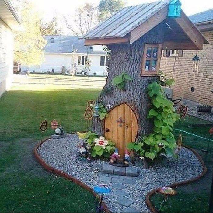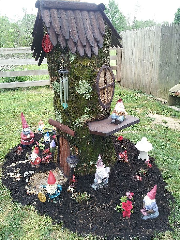 Нужны оригинальные идеи преобразования пня? Как насчет того, чтобы сделать из него сказочный дом? Подарите своим гномам и садовым друзьям дом! Просто закрепите статую гнома на пне и добавьте к ней цветы, гирлянды или даже небольшой домик.