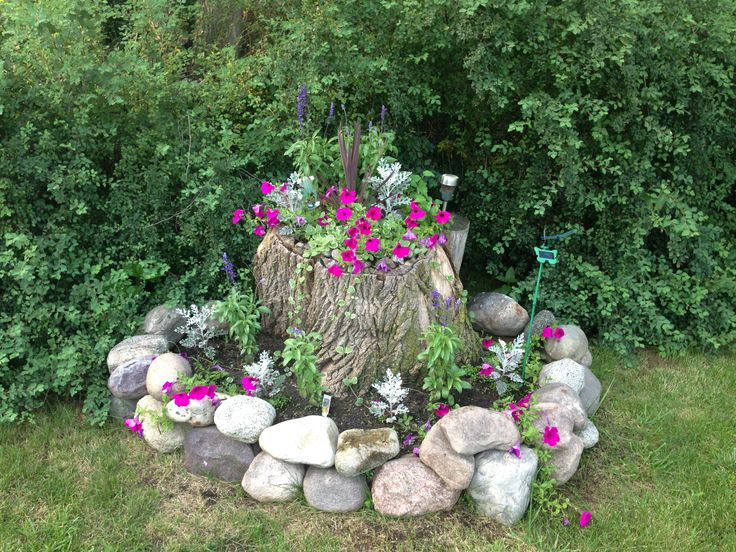 Нет ничего необычного в том, чтобы найти пни, окруженные безжизненной почвой. Добавьте немного жизни, посадив сверху нежные и яркие цветы. Даже если пень мертв, контраст между жизнью цветов и сухостью пня оставляет след.