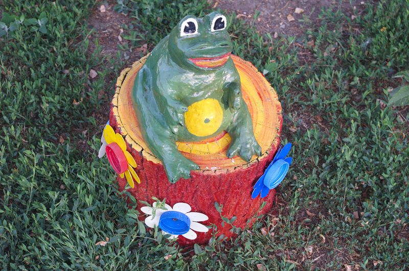 На изображении ниже веселая гипсовая лягушка, которая величественно “покорила” пенек и осталась на нем навсегда. Помимо этого, пень старого дерева украшен подручными предметами, обыкновенным дачным мусором, и раскрашен в веселые цвета. Сказать по правде, это всего за два часа свободного времени и за сумму, которую можно было бы потратить всего на несколько шоколадок.
