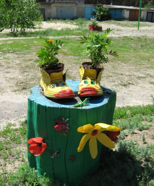 Наверняка, многие из нас выращивают цветы не только в палисаде или специально оборудованных клумбах, но и в горшках, на вертикальных грядках. Следующим нашим предложением станет украшение пня именно такими цветами, в горшках. Можно установить вокруг пня несколько симпатичных глиняных или пластиковых горшков с уже выращенными цветами, а можно и высадить их заново. Кроме того, всегда есть возможность декорировать пенек мхом, обыграть его в сказочном варианте, например, добавив папоротники, яркие цветочки, фигурки животных около, превращая небольшое пространство в самый настоящий лес.