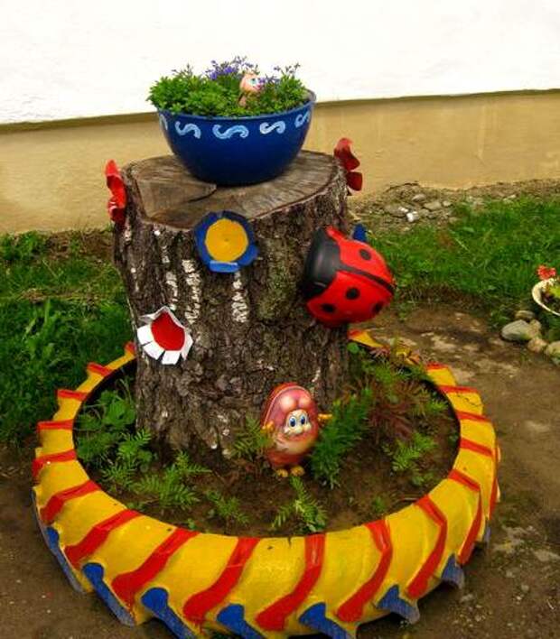Если на грандиозные идеи нет времени или денег, можно сделать так, как показано на фотографии ниже – просто покрасить пень в веселые цвета, установить на плоскости спила цветочки из пластиковых бутылок (изделия из пластиковых бутылок мы изучали не так давно), высадить рядом растения.
