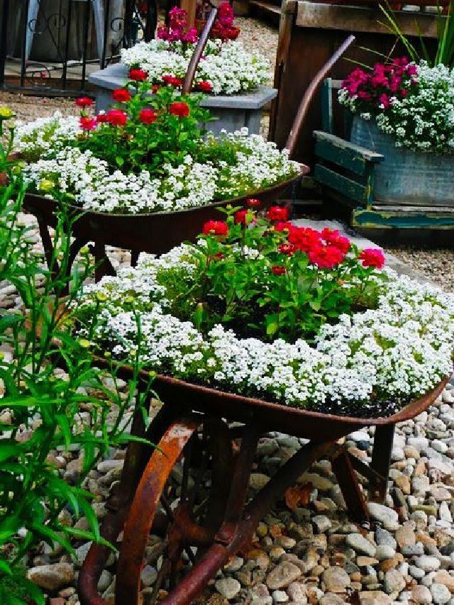 Если вы хотите получить большую клумбу, можно взять старую тачку или даже телегу.